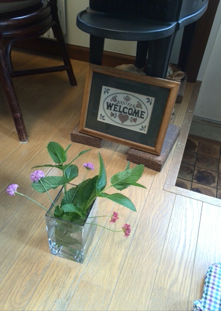 玄関あがってすぐの場所なので、まさかバケツでもなく、ガラスの四角い花瓶にミントとピンクのお花を差してカムフラージュ!