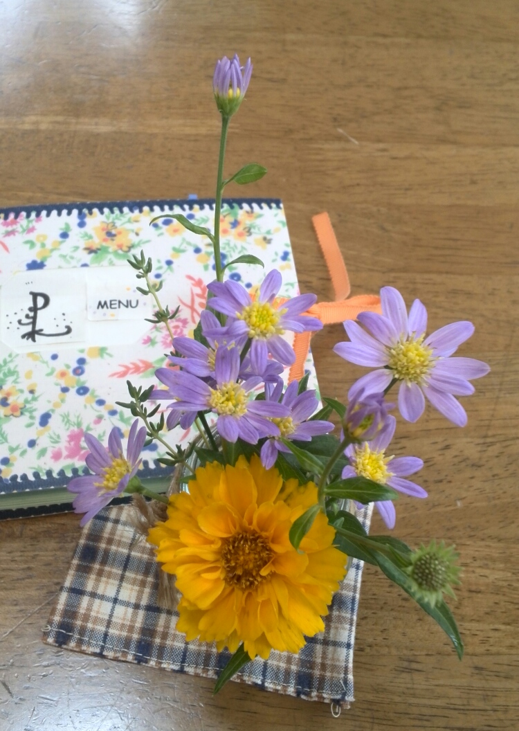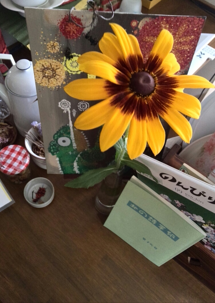 この子は主人の実家の庭先に咲いていました。あいにく名前はわかりませんが、ヒマワリのミニ版のような夏を感じさせてくれるお花です。