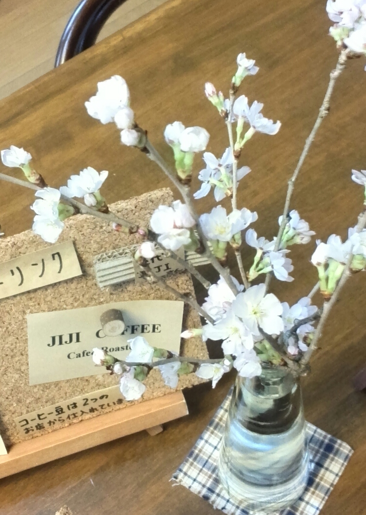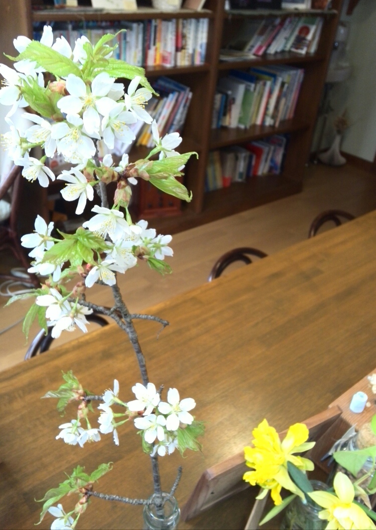 カフェのカウンターには、近くに咲いている山桜が飾ってあります。