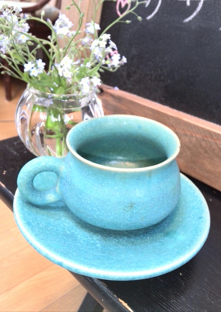 そして今日、食器棚を片付けていたら、私が20歳前後に京都に出張に行った時買った、清水焼のブルーのカップを発見!