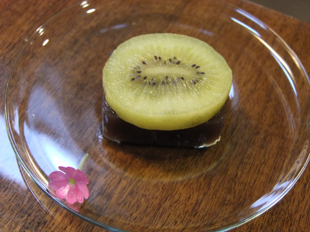 こちらに添えられたお菓子は、虎屋の羊羹の上にゴールデンキウイがのった あゆみさんアイデアのもの。