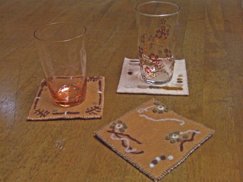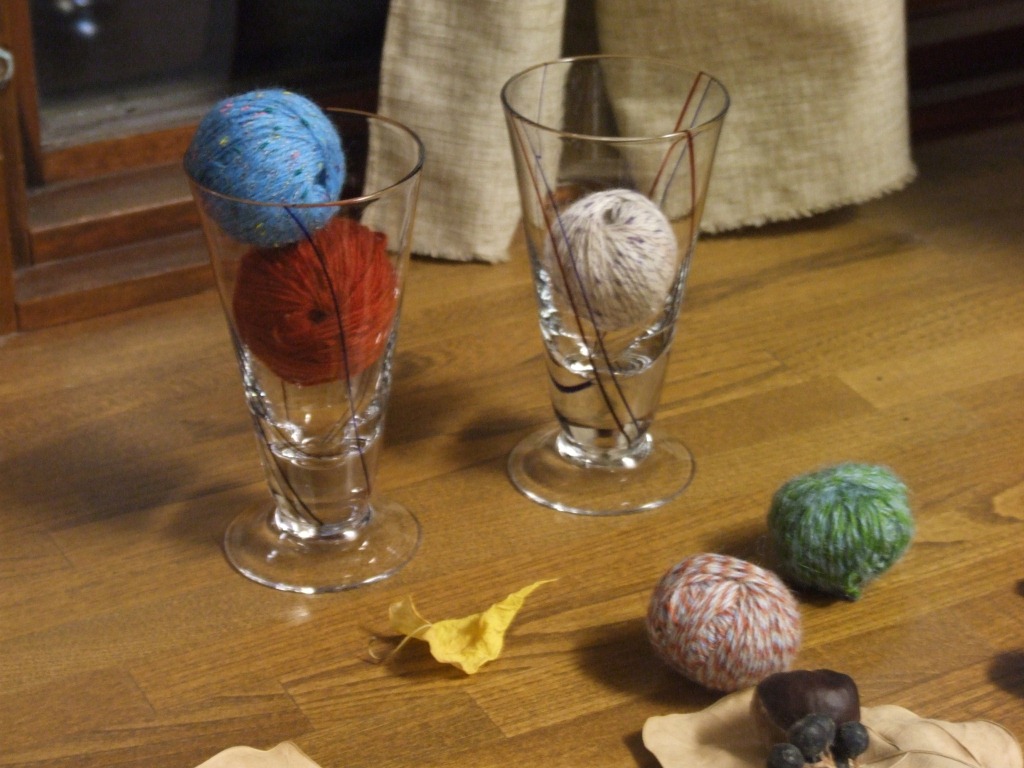 レトロなグラスと、ほっこりとした手作りのコースターとか、手紬の毛糸とか。