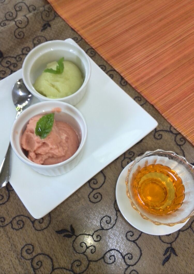 こちらの紅茶には、お茶会では初めてお出しする、シャーベットを二種。メロンとトマト。